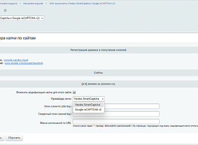 Модуль автоматически заменяет стандартную капчу 1С-Битрикс на Yandex SmartCaptcha / Google reCAPTCHA v2 без правок шаблонов и компонентов.