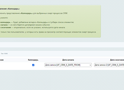 Администрирование → Настройки → Настройки продукта → Настройки модулей → Календарь для смарт-процессов CRM.В настройках модуля отображается список всех смарт-процессов и их направлений (воронок).