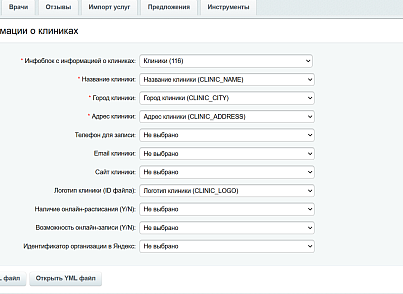 • Гибкая настройка: Вы можете использовать как уже существующие на вашем сайте инфоблоки с информацией о врачах, клиниках и услугах, так и создать их автоматически с помощью модуля. Предусмотрена гибкая настройка соответствия полей инфоблоков и тегов YML-фида.
