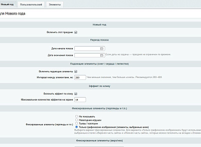 - На каждом празднике можно: • отрегулировать частоту появления падающих элементов; • ограничить максимальное количество одновременно активных эффектов по клику; • отключить любую группу эффектов (фон, клики, фиксированные элементы).