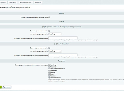 - для каждого праздника: • включение/отключение; • период показа (дата начала/окончания).