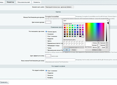 - Вместо обычного курсора рядом с указателем появляется иконка Font Awesome (снежинка, сердце и т.п.);