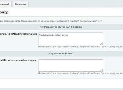 - Подключите компонент декора на нужную страницу (обычно это главная или шаблон сайта). Компонент не требует детальной настройки — всё берётся из настроек модуля.