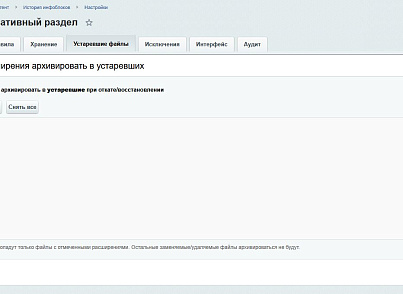 - Индивидуальные политики: Для каждого инфоблока можно задать свои сроки хранения и лимиты версий.