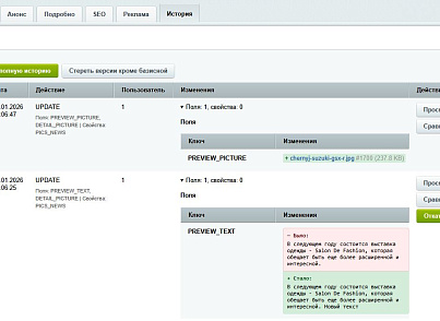 - Быстрый доступ: Вкладка «История» встроена прямо в карточку редактирования элемента/раздела.