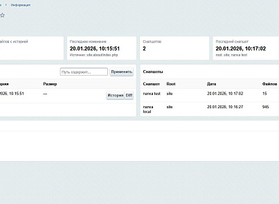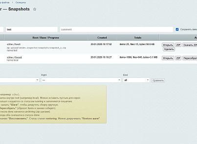 Вопрос: Можно ли восстановить файлы из снапшота?Ответ: Да. Модуль может создать ZIP-архив снапшота и затем восстановить из него файлы с сохранением оригинальных прав (chmod) и временных меток (mtime).