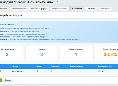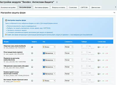 - Статистика по формам — эффективность защиты для каждой формы
