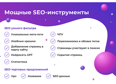![]() | SEO инструменты. Шаблон включает мощные инструменты для SEO: умный фильтр, микроразметка Schema Org, OpenGraph, блоки перелинковки и канонические ссылки. |