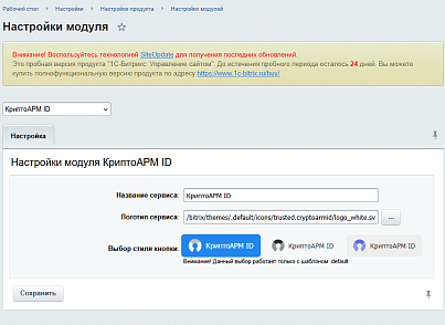 Администрирование → Marketplace → Установленные решения. - Найдите модуль КриптоАРМ ID (trusted.cryptoarmid) и выполните его установку.