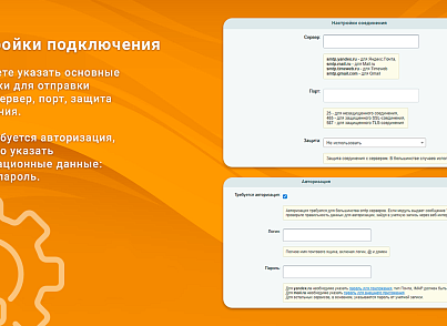 - Вы можете указать основные настройки для отправки почты: сервер, порт, защита соединения. Авторизационные данные: логин и пароль, требуется ли авторизация.