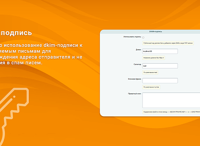 - Доступно использование dkim-подписи к отправляемым письмам для подтверждения адреса отправителя и не попадания в спам писем.