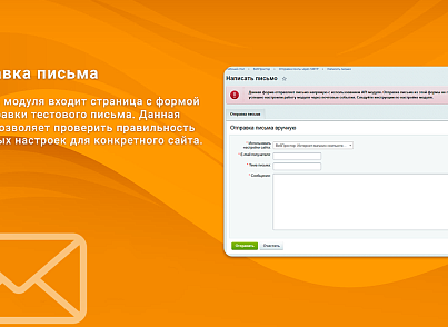 - В состав модуля входит страница с формой для отправки тестового письма. Данная форма позволяет проверить правильность указанных настроек для конкретного сайта.