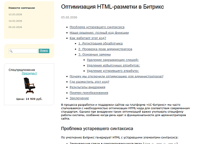 Умное оглавление — это модуль для 1С-Битрикс, который автоматически создает навигационное меню на основе заголовков H2-H6 вашего контента. Меню помогает посетителям быстро ориентироваться в материале и переходить к нужным разделам. Это значительно улучшает пользовательский опыт на страницах с большим объемом текста: статьях, документации, новостях, блогах и инструкциях.